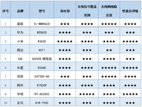 10款路由器样品比较试验性能测试评级表▼