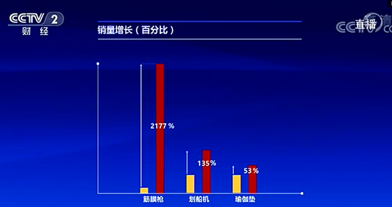 除了这个领域之外还有另外一个领域的产品销量增幅也非常大。我们来看一下,首先大家看到的这个产品是筋膜枪,增长2177%。划船机同比增长135%,瑜伽垫销量同比增长了53%。这三样产品勾勒出的是非常火热的健身产品。在刚才这三样产品当中值得一提的是筋膜枪,可能有不少人对这个名称感觉到有一点陌生,一点不假,原来筋膜枪可能更多的是用在专业的健身房当中,你的教练用筋膜枪通过它的高频震动帮你放松肌肉,但是宅在家里的人们从来没有放弃锻炼,所以不管是筋膜枪也好,划船机也好,瑜伽垫也好都成了我们锻炼的好帮手。