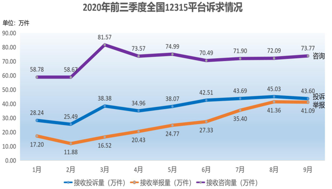 今年10月19日,市场监管总局网站发布全国12315平台2020年前三季度统计数据。数据显示,全国12315平台前三季度共计接收消费者投诉举报咨询1211.78万件,为消费者挽回经济损失22.29亿元,同比增长72.44%。