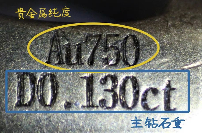 三识克拉重,如果是镶嵌类首饰还会多一步——镶嵌宝石的印记。镶嵌钻石首饰,主钻石重在0.1克拉以上,要刻石重印记。(如图示3,钻戒上“D0.130ct”印记,说明其主钻石重量是0.13克拉,“d0.06ct”说明其配镶钻石总重为0.06克拉 )。