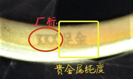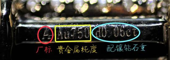 (2)印记。除了明面儿上的标签信息,还有一份信息“情报”——印记。根据国家标准GB 11887《首饰 贵金属纯度的规定及命名方法》规定,印记内容应包括:厂家代号、材料、纯度及镶嵌首饰主钻石(0.10克拉以上)的质量。与标签不同的是,印记往往是细微不易观察的,一般需要借助10倍放大镜才能看清印记内容。