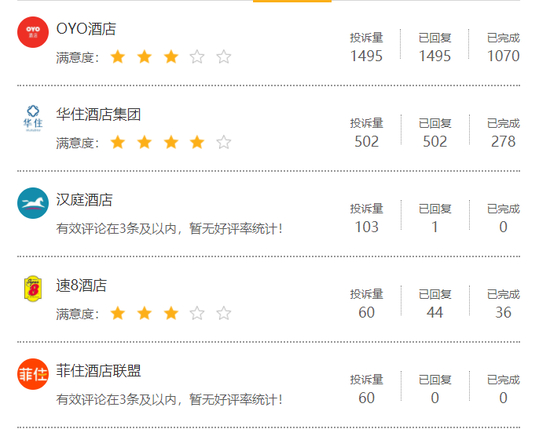 从黑猫投诉平台的数据看,在酒店民宿类中,Airbnb爱彼迎的投诉量明显较多,可能和体量也有一定的关系。按照品牌排名,OYO酒店的投诉数量明显超出其他。酒店民宿们的优点是投诉回复率普遍比较高,希望回复率能和解决问题的效率成正比。