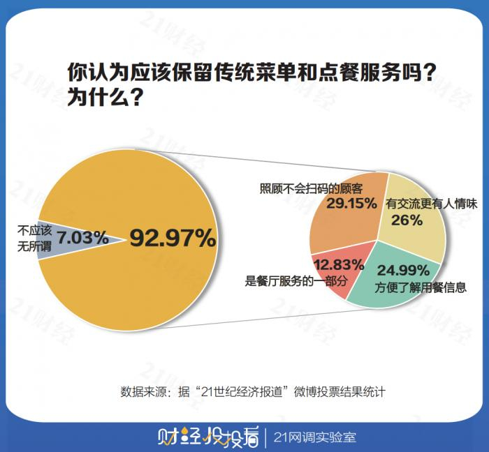 21网调实验室调查结果显示,约93%的网友认为应该保留传统菜单和点餐服务,不能为降成本减了服务。其中近三成网友强调,店家应该照顾不会扫码点餐的顾客。