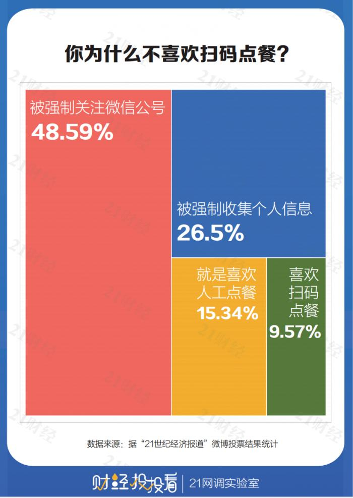 调查显示,有48.59%的网友表示,非常反感被强制关注小程序或商家微信公号;其次约26.5%的网友认为,商家没有必要也没有权利收集与点餐无关的个人信息。