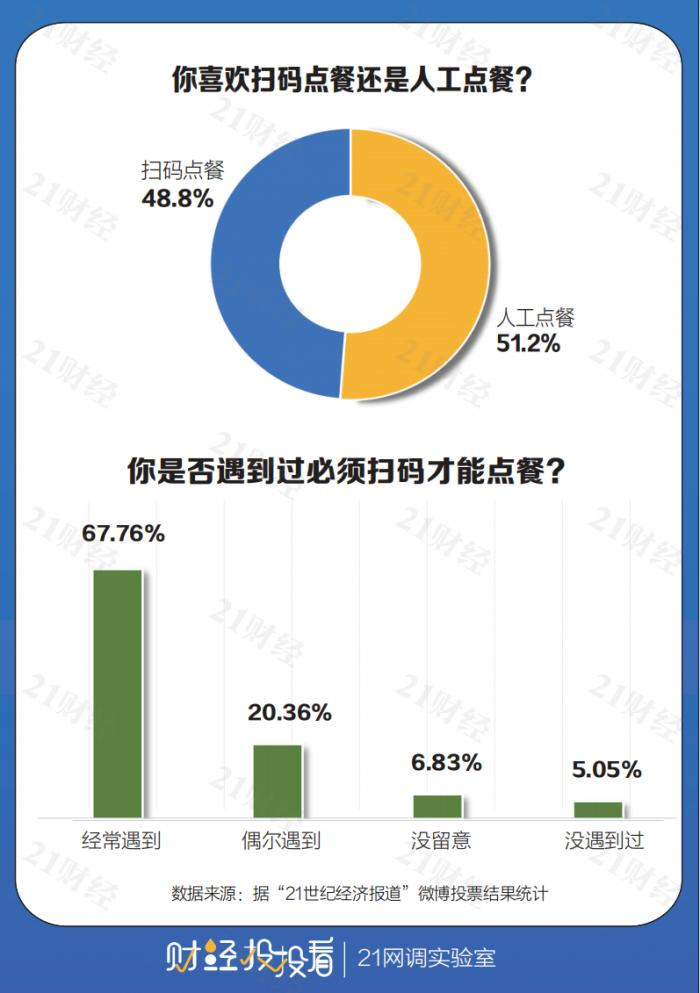据21网调实验室的调查显示,仅48.8%的网友表示喜欢扫码点餐,超过51%的网友希望保留人工点餐。事实上,人工点餐正在被逐步取代。