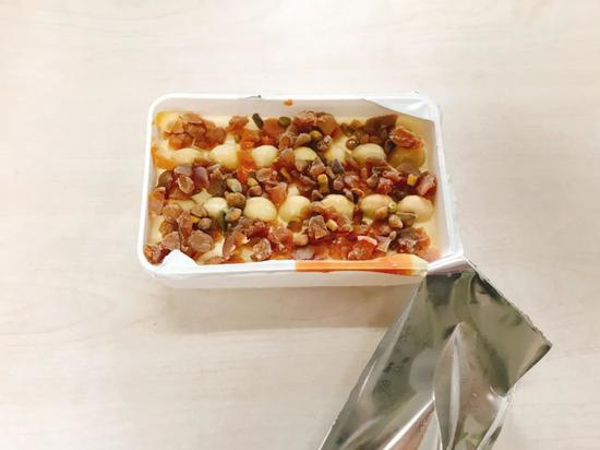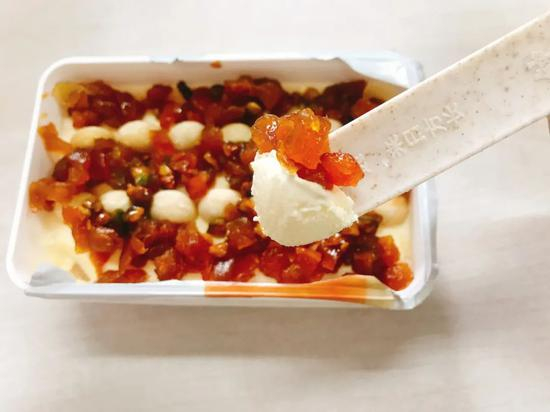 右边是还没有我巴掌大的“糕”,铺满一层杏肉果脯和夏威夷果以及不知名干果,下面是带夹心的冰淇淋。据同事形容,“好像把榨菜洒在大米饭上啊”。
