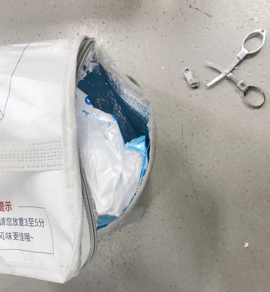 无奈我只能硬剪。虽然心理预期分量不会太大,但是袋子一共塞满8个干冰,以及一个肥皂盒大的冰淇淋的确有点过分,这还不算目测10层的保鲜膜体积。