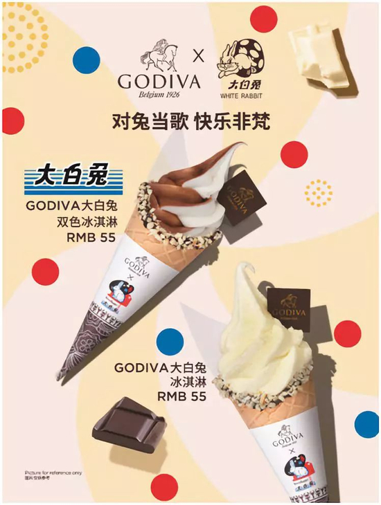 高端化的另一个捷径是抬咖式联名, 光明的大白兔和歌帝梵联姻推出价值55的冰淇淋。童年回忆终于也变成高攀不起的样子。