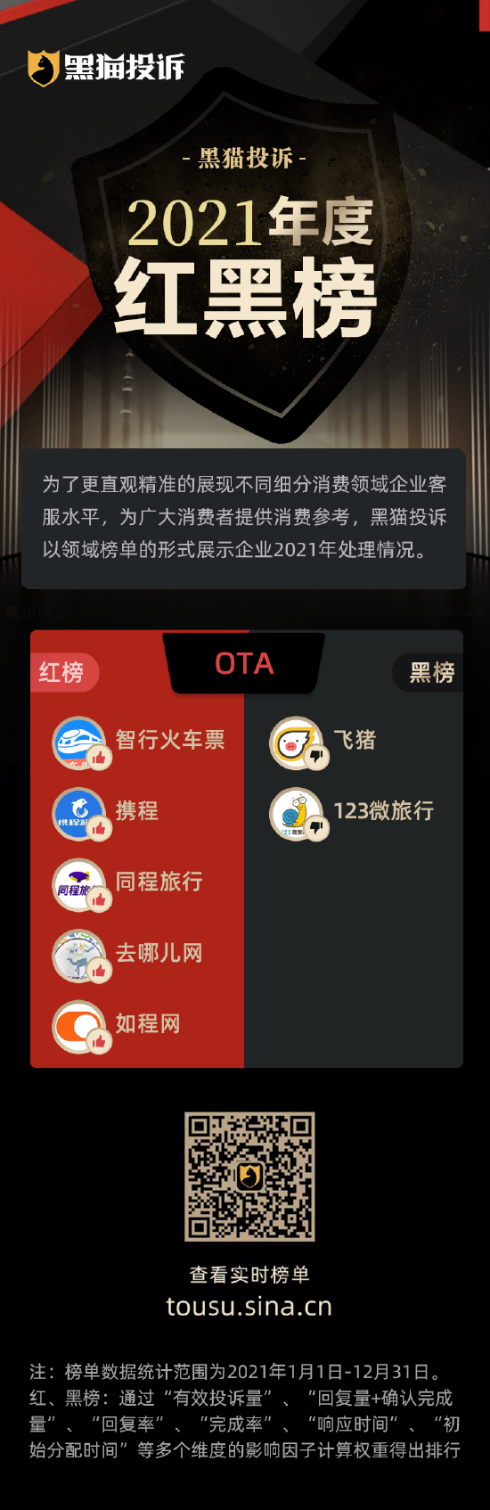智行火车票、携程、同程旅行、去哪儿网、如程网及时回复、解决消费者诉求,登上OTA领域红榜,而飞猪、123微旅行回复及响应解决情况较差,位于OTA领域黑榜。