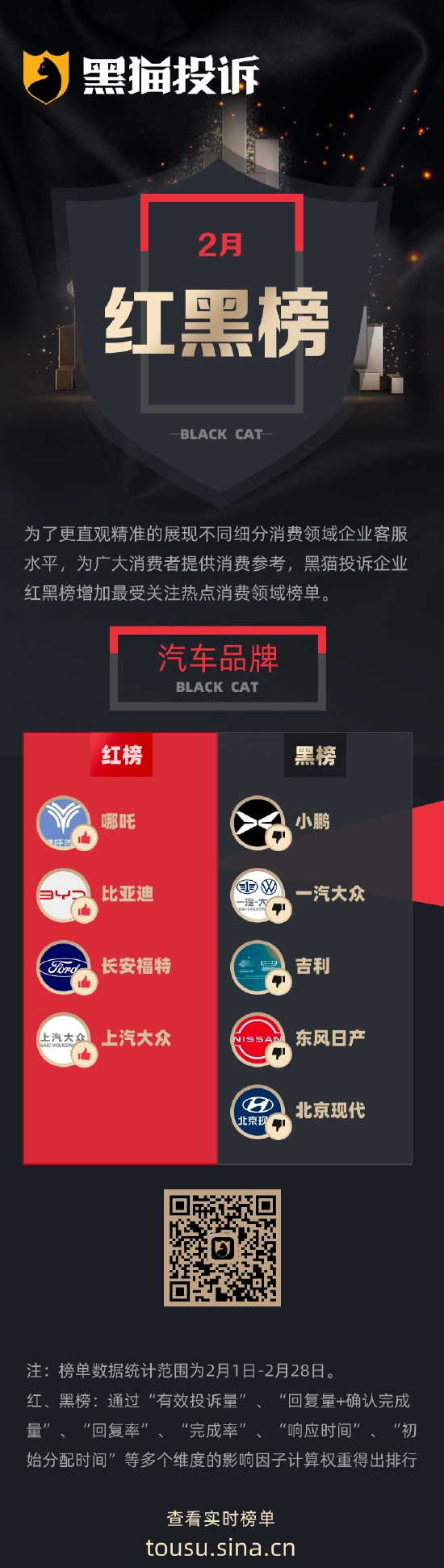 2月黑猫投诉汽车领域红黑榜——小鹏汽车不退定金