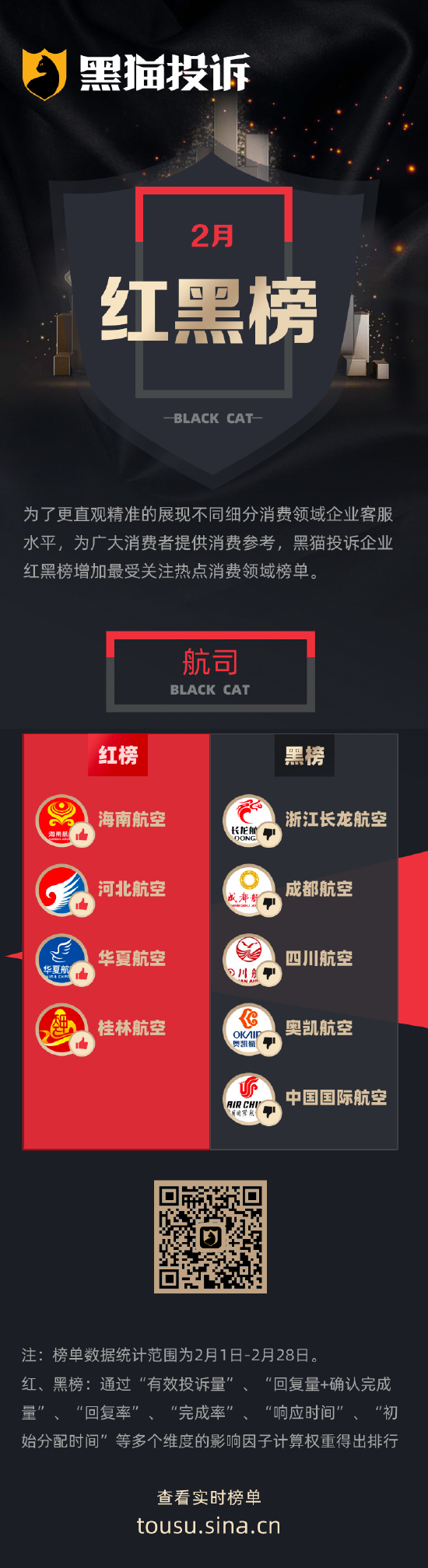 黑榜:飞猪、浙江长龙航空、成都航空、如程网、四川航空、奥凯航空、中国国际航空、青岛航空、深圳航空、东海航空