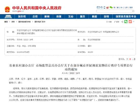 2022年11月,农业农村部办公厅、市场监管总局办公厅发布《关于在部分城市开展规范宠物诊疗秩序专项整治行动的通知》,农业农村部、市场监管总局决定从2022年10月至2023年5月,在部分城市集中开展规范宠物诊疗秩序专项整治行动。