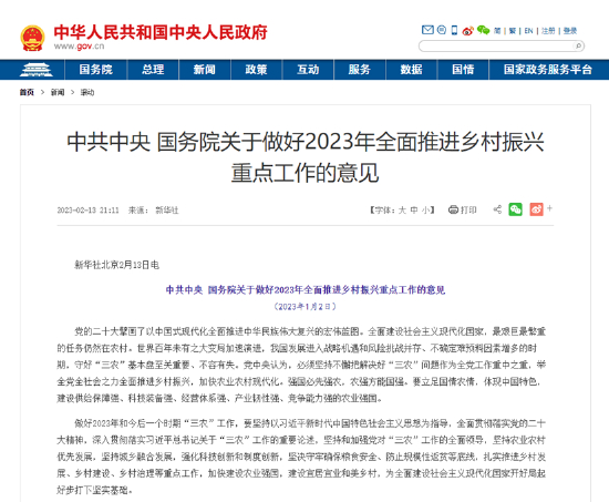 2023年2月13日,《中共中央国务院关于做好2023年全面推进乡村振兴重点工作的意见》要求,提升净菜、中央厨房等产业标准化和规范化水平,培育发展预制菜产业。这是预制菜自问世以来首次被写入中央一号文件,对此,业内反响十分热烈。