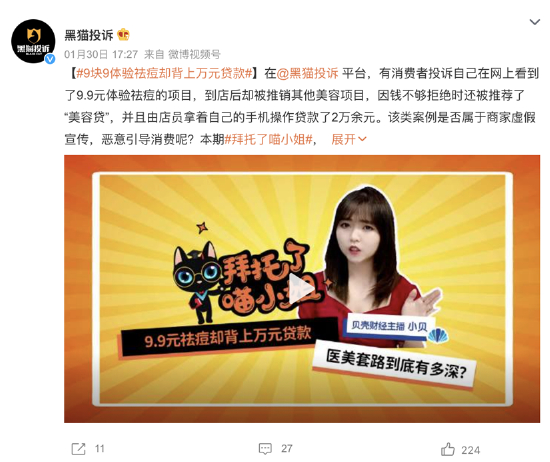 在黑猫投诉平台上,有消费者反馈自己在网上看到了9.9元体验祛痘的项目,到店后却被推销其他美容项目,因钱不够拒绝时还被推荐了“美容贷”,并且由店员拿着自己的手机操作贷款了2万余元。