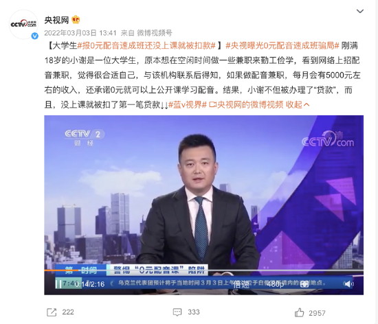 2022年3月3日,央视网#报0元配音速成班还没上课就被扣款#话题登上热搜。据悉,刚满18岁大学生小谢,原本想在空闲时间做一些兼职来勤工俭学,看到网络上招配音兼职,与该机构联系后得知,如果做配音兼职,每月会有5000元左右的收入,还承诺0元就可以上公开课学习配音。结果,小谢不但被办理了“贷款”,而且,没上课就被扣了第一笔贷款。