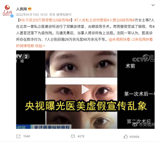2022年4月15日,#女子花近8万整容整出9级伤残#登上热搜,阅读量超2亿。据悉,方女士等7人在北京一家私立医美诊所进行了双眼皮修复、去眼袋等手术。然而整容变成了毁容,有4人甚至还落下九级伤残。沟通无果后,当事人将诊所告上法庭。法院一审认为,医美诊所存在欺诈行为,7人分别获赔29万余元至80万余元不等。