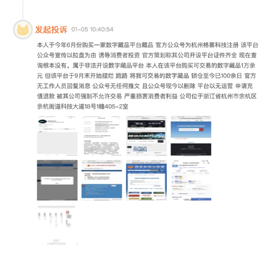 在黑猫投诉平台上,有不少投诉反馈数字藏品平台投诉反馈平台本身存在违法违规经营情况,平台在不具备相应资质情况下违规开设二级市场。通过虚假宣传诱导用户在平台投资交易,后续出现限制用户交易提现,甚至直接关闭服务器失联等情况,导致用户资金损失却维权无门。有消费者投诉称一数字藏品平台以拉盘为由诱导投资,但却查询不到相关证照。在该平台购买可交易的数字藏品1万余元后平台于9月末开始摆烂、跑路。