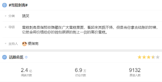 在微博搜索关键词“雪糕”,弹出的相关话题也尽是吐槽色彩:“雪糕为何越卖越贵”、“当代雪糕价格有多离谱”、“不认识的雪糕不要轻易拿”……多个话题阅读量过亿,讨论量过万。在“雪糕刺客”冲上热搜后,人们一边谴责不讲武德的销售套路,一边纷纷求问“便宜的雪糕都去哪里了”。