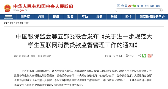 其实早在2021年3月,银保监会等五部委就发布了《关于进一步规范大学生互联网消费贷款监督管理工作的通知》,明确小额贷款公司不得向大学生发放互联网消费贷款,进一步加强消费金融公司、商业银行等持牌金融机构大学生互联网消费贷款业务风险管理,明确未经监管部门批准设立的机构一律不得为大学生提供信贷服务。