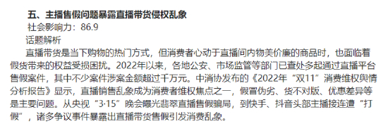 我国网络直播新业态呈“井喷式”发展态势,直播带货是当下购物的热门方式,然而,一些直播带货的商品看似物美价廉,背后却可能潜藏制假售假的“猫腻”。中消协发布的《2022年“双11”消费维权舆情分析报告》显示,直播销售乱象成为消费者维权焦点之一。据黑猫大数据中心统计,以“直播间”为关键词在黑猫投诉平台进行检索,2022年相关投诉约4.6万条,投诉大多集中于直播间商品虚假宣传、商品假冒伪劣、货不对版等。
