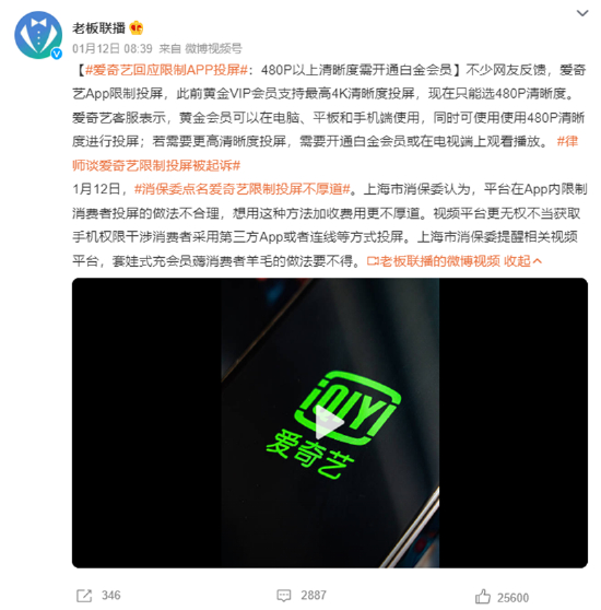 近期爱奇艺APP开始限制投屏功能引发大量关注。网友表示,原来黄金VIP会员最高可支持4K清晰度投屏,后只支持480P清晰度。又有网友反馈,爱奇艺同样还限制了用HDMI线连接电视播放,被弹窗“由于版权原因,此内容不支持HDMI连线播放”。