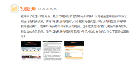 有消费者投诉称购买了优酷VIP包月后,投屏电视端时被告知需另外付费11元充值至酷喵视频VIP后才能进行电视端投屏。