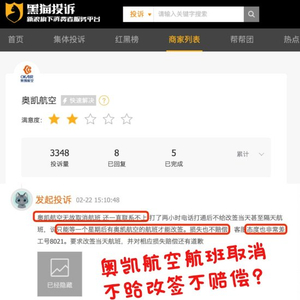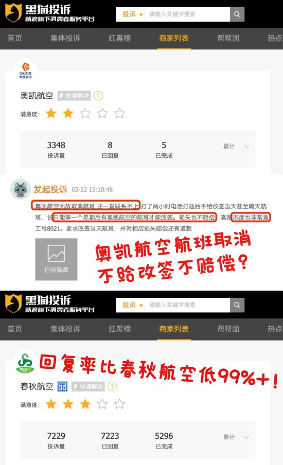奥凯航空航班取消不给改签不赔偿?投诉回复率比春秋航空低99%以上!
