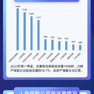 2023年第一季度,众惠相互保险投诉量1900件,占财产保险公司投诉总量的16.7%,居财产保险公司之首。