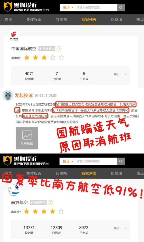国航编造天气原因取消航班?投诉回复率比南方航空低91%