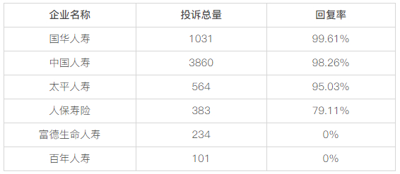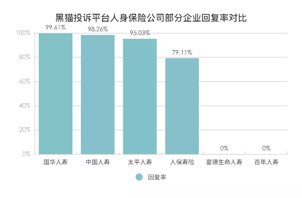 黑猫投诉发布人身保险公司投诉数据对比:富德生命人寿、百年人寿回复率为0