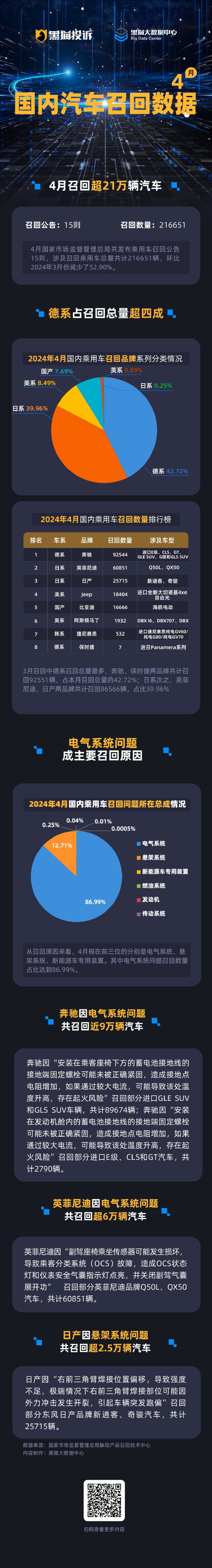 黑猫投诉发布4月国内汽车召回数据:电气系统是主因 奔驰召回9万辆