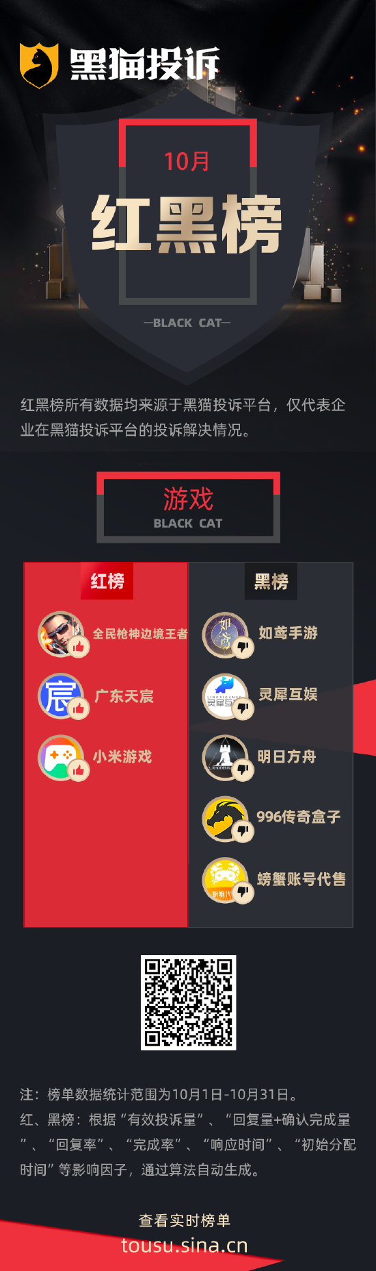 10月黑猫投诉游戏领域红黑榜:如鸢活动bug破坏游戏公平