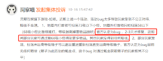 10月黑猫投诉平台收到用户反馈,在《如鸢》手游近期上线的活动中,部分玩家通过bug反复刷取高级道具“精密匣子”,因该道具为游戏内付费项目,对氪金玩家十分不公平。此bug存续3天后,官方进行了修复但未发任何公告,在玩家发帖质疑后才仅提供少量游戏代币作为补偿,引发大量玩家不满。