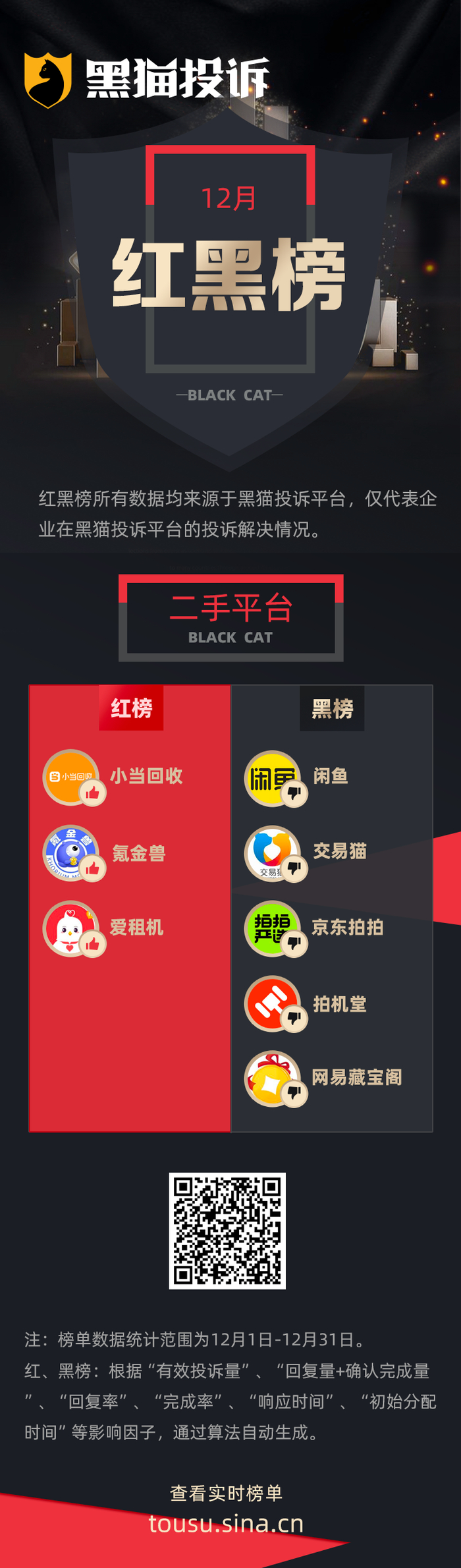 黑猫投诉发布12月企业投诉处理红黑榜单,数据均来源于黑猫投诉平台,反映了企业在黑猫投诉平台的投诉处理解决情况。