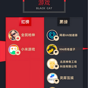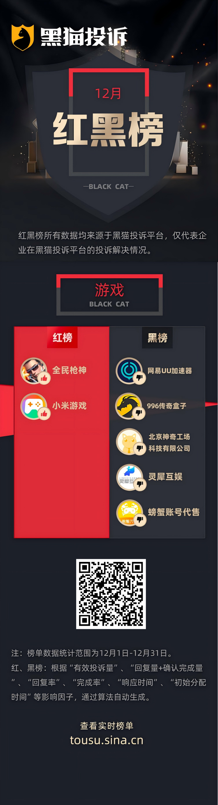 12月黑猫投诉网游领域红黑榜:网易UU加速器加速无效且不予退费