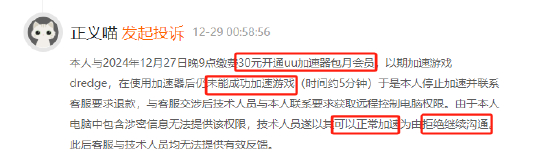 在本月中有用户向黑猫投诉平台反馈称,消费者花费30元开通uu加速器包月会员,但在使用加速器后未能成功加速游戏(时间约5分钟)。之后消费者联系客服要求退款,与客服交涉后,技术人员与消费者联系要求获取远程控制电脑权限。由于电脑中包含涉密信息本人无法提供该权限,技术人员便以正常加速为由拒绝继续沟通。此后客服与技术人员均无法提供有效反馈。在本月中网易UU加速器累计投诉587单,回复率仅为16.86%。