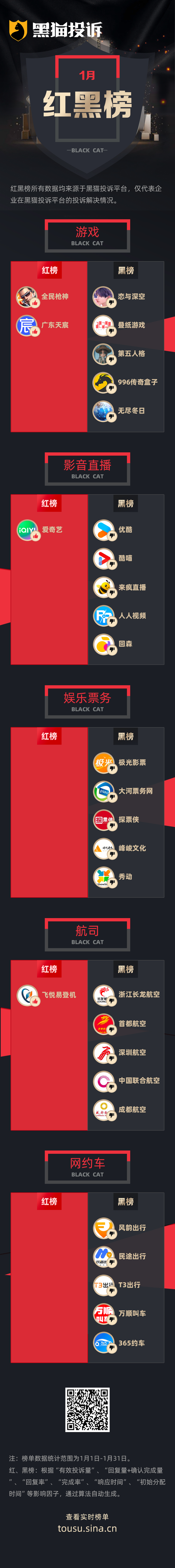 黑猫投诉1月行业红黑榜单