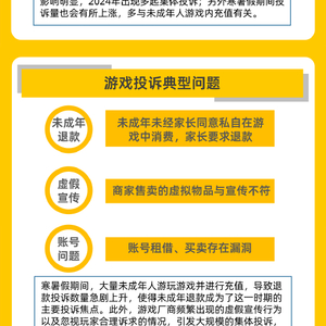 寒暑假期间,大量未成年人游玩游戏并进行充值,导致退款投诉数量急剧上升,使得未成年退款成为了这一时期的主要投诉焦点。此外,游戏厂商频繁出现的虚假宣传行为以及忽视玩家合理诉求的情况,引发大规模的集体投诉,尤其集中在手机游戏领域。与此同时,随着游戏行业的蓬勃发展,账号租借与买卖行为日益普遍,然而这一过程中却暴露出诸多漏洞,诸如账号被找回、租借账号被用于非法行为(如使用外挂)等问题层出不穷,这些也成为了玩家投诉的又一热点。