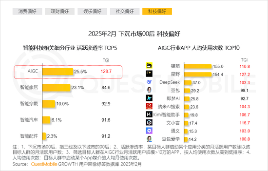 高线城市00后对工具类AIGC APP月人均使用时长大部分低于1小时,主打“用完就跑,绝不深交”,猫箱、星野情感类APP月人均使用时长800+分钟, “AI纸性恋”成为新潮流。
