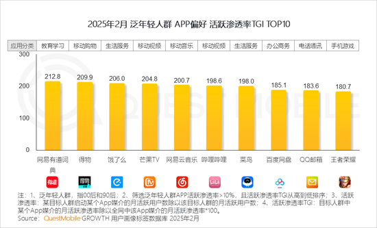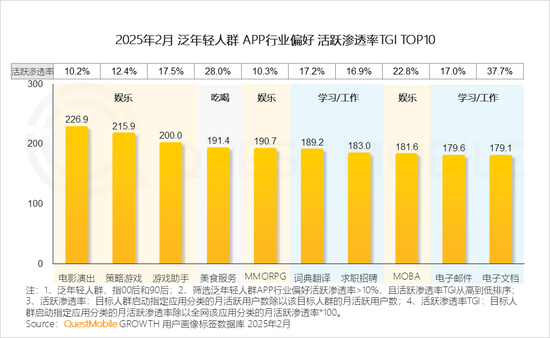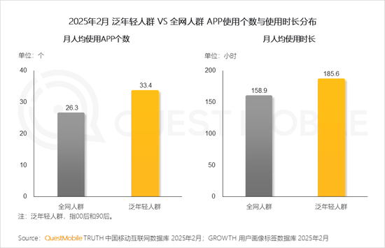 QuestMobile数据显示,与全网人群相比,泛年轻人群月人均使用APP个数多7个,月人均使用时长增加26.7小时。