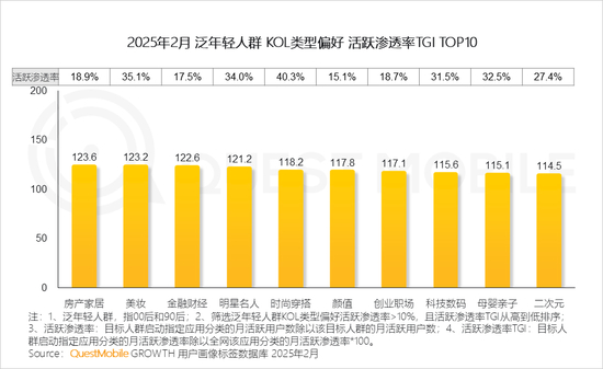 同时,年轻用户的内容获取渠道中,KOL、流量个人和团体影响力比较高,房产家居、美妆、金融财经、明星名人、时尚穿搭、颜值等类型KOL,都位居活跃渗透率前列;此外,在年轻人的影响下,动漫/二次元文化相关内容已经从边缘走向了主流。