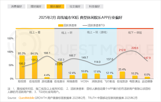 具体的用户画像上看,年轻人的消费模式理性与放飞并存,例如,高线城市90后消费偏好上,情绪价值、圈层认同、科技新奇感都是很重要的要素,由此形成线上以视频和音乐娱乐为主,线下以旅游、演出和健身为主。