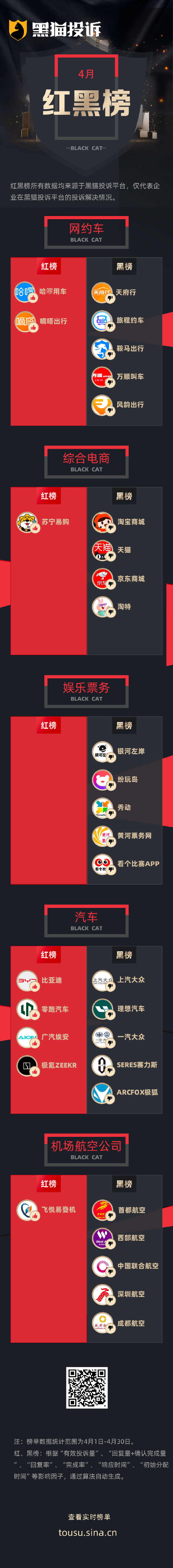 黑猫投诉发布4月企业投诉处理红黑榜单,数据均来源于黑猫投诉平台,反映了企业在黑猫投诉平台的投诉处理解决情况。