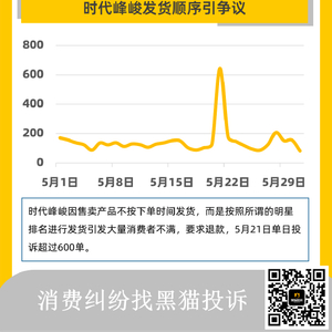 时代峰峻因售卖产品不按下单时间发货,而是按照所谓的明星排名进行发货引发大量消费者不满,要求退款,5月21日单日投诉超过600单。