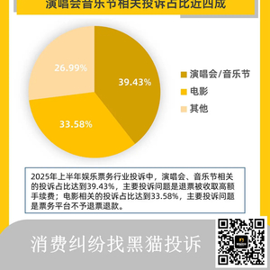 2025年上半年娱乐票务行业投诉中,演唱会、音乐节相关的投诉占比达到39.43%,主要投诉问题是退票被收取高额手续费;电影相关的投诉占比达到33.58%,主要投诉问题是票务平台不予退票退款。