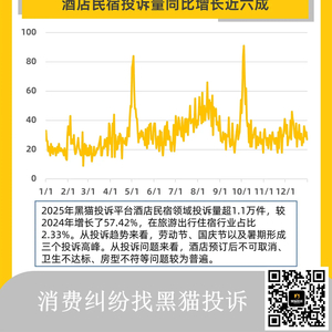 2025年黑猫投诉平台酒店民宿领域投诉量超1.1万件,较2024年增长了57.42%,在旅游出行住宿行业占比2.33%。从投诉趋势来看,劳动节、国庆节以及暑期形成三个投诉高峰。从投诉问题来看,酒店预订后不可取消、卫生不达标、房型不符等问题较为普遍。