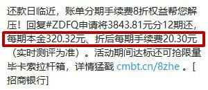 招商银行:每期手续费20.30元,还是“折后”,看起来非常划算。然而计算一下就知道年化费率为6.34%。