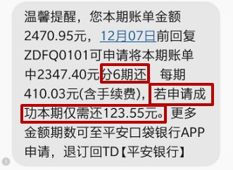 平安银行:“申请成功本期仅需还123.55元”,“分6期还”,这条短信直接给客户带来了误解,一共还6期,第一期还123.55元,似乎是首期优惠了286.48元。然而实际上,是在本期还款123.55元之后,还需要再还6期410.03元,总计需还款2583.73元,年化费率为10.07%。