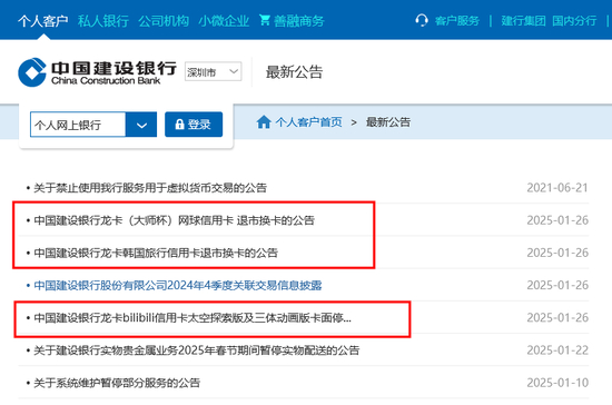 值得注意的是,除停发bilibili联名卡之外,建行今日还公告韩国旅行信用卡、龙卡(大师杯)网球信用卡两款卡片也将于近期退市,提醒用户注意换卡。