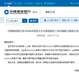 在公告中,建行表示,由于该行与幻电科技(上海)有限公司关于龙卡bilibili信用卡太空探索版及龙卡bilibili信用卡三体动画版卡面授权即将到期,上述龙卡bilibili信用卡卡面将于2025年1月27日起不再发行。